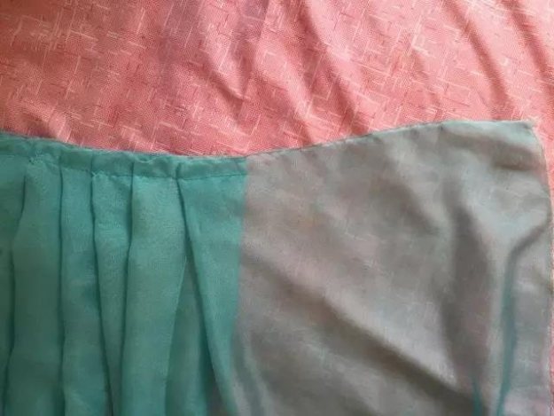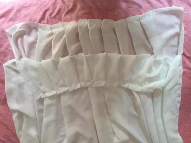 4.布料的一端留15cm不打褶,另一端打满褶子。留出这空白的15cm对折裙子,挑开正中间刚刚缝好的两个褶子。