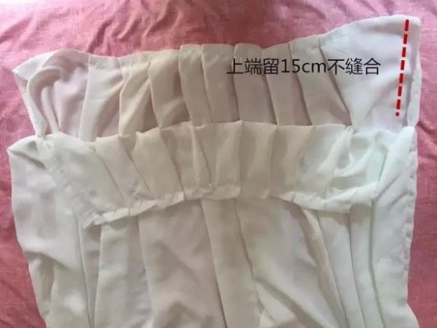 5.前后片都打好褶之后,将左右两侧用来去缝缝好,裙子上端留15cm不缝在一起。如图。