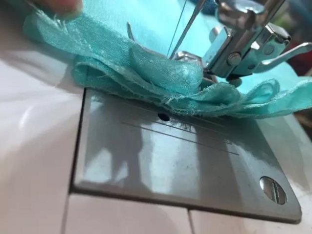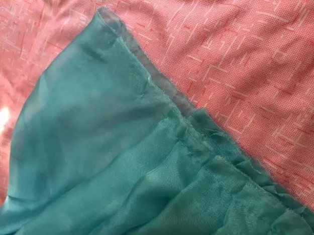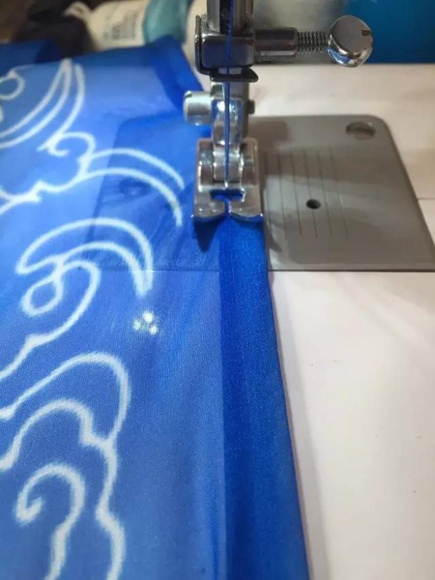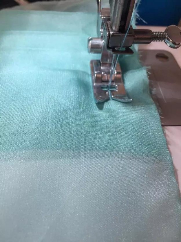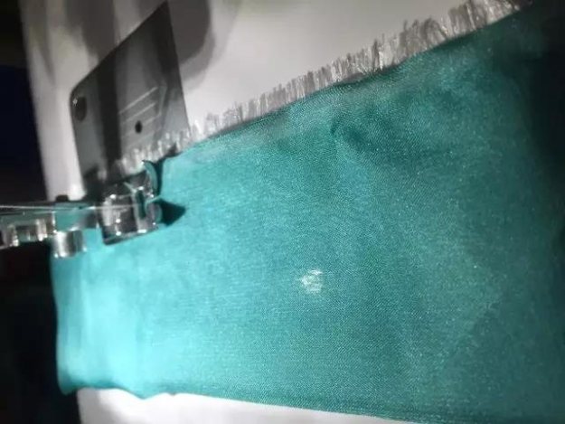 2.将两块布料的长,也就是我们的裙摆卷起来锁边。先锁边可避免一会儿到处勾丝。