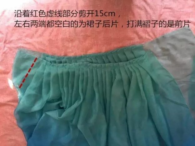 5.沿着红色虚线部位剪开15cm,左右两端都空白的为裙子后片,打满褶子的是前片。