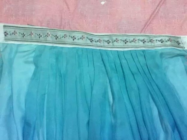 3.将两块布料打好褶子。前片裙头长度等于(腰围÷2+15cm),后片长度也是(腰围÷2+15cm),后片两端可以留15cm左右不打褶,前片正常将褶子打满,这样穿上身,前后两片裙子重叠的部分不会显得臃肿,避免显胯宽。