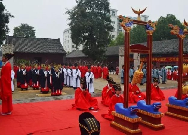 祭孔大典中石门汉韵同袍担任义工,女子统一明制袄裙,男子黑红配色,以适应典礼场合。