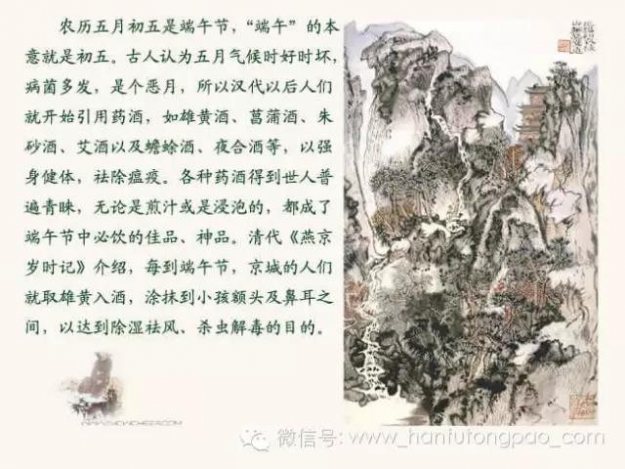 又称端阳节、重午节、端五节、重五节、女儿节、天中节、地腊节。时在农历五月五日,大约形成于春秋战国之际。人们为了辟邪、除恶、解毒,有饮菖蒲酒、雄黄酒的习俗。同时还有为了壮阳增寿而饮蟾蜍酒和镇静安眠而饮夜合欢花酒的习俗。最为普遍及流传最广的是饮菖蒲酒。据文献记载:唐代光启年间(885-888年),即有饮“菖蒲酒”事例。唐代殷尧藩在诗中写道:“少年佳节倍多情,老去谁知感慨生,不效艾符趋习俗,但祈蒲酒话升平”。后逐渐在民间广泛流传。历代文献都有所记载,如唐代《外台秘要》、《千金方》、宋代《太平圣惠方》,元代《元稗类钞》,明代《本草纲目》、《普济方》及清代《清稗类钞》等古籍书中,均载有此酒的配方及服法。菖蒲酒是我国传统的时令饮料,而且历代帝王也将它列为御膳时令香醪。明代刘若愚在《明宫史》中记载:“初五日午时,饮朱砂、雄黄、菖蒲酒、吃粽子。清代顾铁卿在《清嘉录》中也有记载:“研雄黄末、屑蒲根,和酒以饮,谓之雄黄酒”。由于雄黄有毒,现在人们不再用雄黄兑制酒饮用了。对饮蟾蜍酒、夜合欢花酒,在《女红余志》、清代南沙三余氏撰的《南明野史》中有所记载。