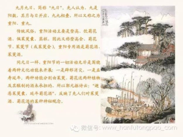 又称重九节、茱萸节,时在农历九月初九日,有登高饮酒的习俗。始于汉朝。宋代高承著的《事物纪原》记载:“菊酒,《西京杂记》曰:'戚夫人待儿贾佩兰,后出为段儒妻,说在宫内时,九月九日佩茱萸,食蓬饵,饮菊花酒,云令人长寿'。登高,《续齐谐记》曰:'汉桓景随费长房游学'。谓曰:'九月九日,汝家当有灾厄,急令家人作绢囊,盛茱萸,悬臂登高山,饮菊花酒,祸乃可消'。景率家人登,夕还,鸡犬皆死。房曰,'此可以代人'。”自此以后,历代人们逢重九就要登高、赏菊、饮酒,延续至今不衰。