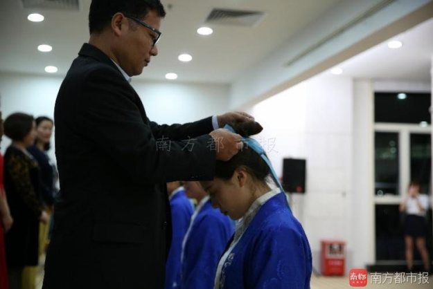 别开生面:大学生们在学校穿上汉服 父母老师为他们赐字、敬饮