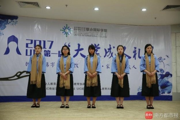 如何才算成人?昨日,位于珠海唐家湾的北京师范大学-香港浸会大学联合国际学院(简称 UIC)于校内举办首届“大学成人礼”,邀请了父母、师长、社会贤达为八位学生举行加冠、赐字、聆讯、明志、敬饮的仪式,宣告学生长大成人,担负成人的责任,完成社会角色的转变。