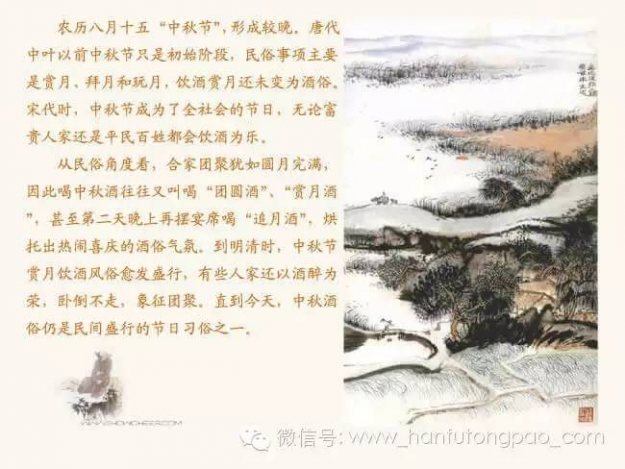 又称仲秋节、团圆节,时在农历八月十五日。在这个节日里,无论家人团聚,还是挚友相会,人们都离不开赏月饮酒。文献诗词中对中秋节饮酒的反映比较多,《说林》记载:“八月黍成,可为酎酒”。五代王仁裕著的《天宝遗事》记载,唐玄宗在宫中举行中秋夜文酒宴,并熄灭灯烛,月下进行“月饮”。韩愈在诗中写道:“一年明月今宵多,人生由命非由他,有酒不饮奈明何?”到了清代,中秋节以饮桂花酒为习俗。据清代潘荣陛著的《帝京岁时记胜》记载,八月中秋,“时品”饮“桂花东酒”。