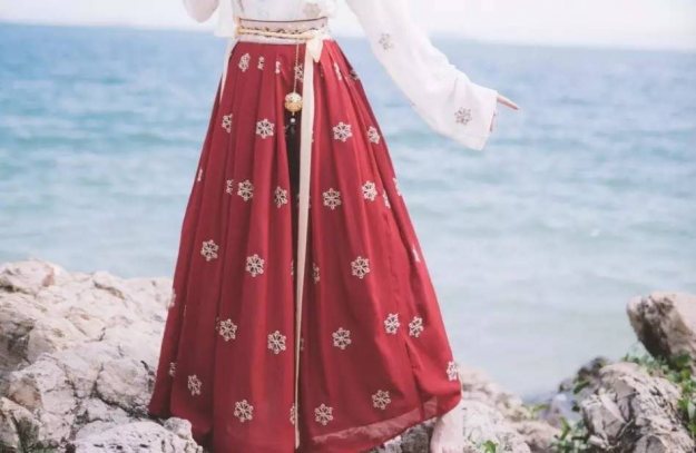 既然石榴裙和石榴并无相关,那为什么叫石榴裙?前面讲到了红色的来源和石榴一词的“贵气”。而唐代的女子,就喜欢穿这种颜色的裙子,其色如石榴之红,故称为石榴裙。再后来石榴裙三字在文人墨客笔下也逐渐成为了女子的代名词,现代人都知道,穿上正红衣服,肤色显白,气色显好,而在遥远的唐代,颜色未必如现在工业染色之纯,却也因穿上了石榴裙,而显得明艳动人。梅花香满石榴裙。风卷葡萄带,日照石榴裙…写的是花,明明是美人。这一句句诗文中的石榴裙,让人想起唐诗宋词里的灯火阑珊,想起不同节庆的繁华闹市,想起草长莺飞的江南春色,读起来,竟是满口香甜。