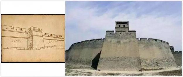「马面」首见于《墨子》中的《备梯》(墨子提到对付云梯攻城的办法就是行城之法),「行城」即「马面」。在战国时,作为城墙的重要构造的它,已被用于城市防御了。从外观上来看,「马面」就是从城墙凸出、以三面抵御外敌的一道防护,若敌军兵临城下,则射手可以登上马面墙台回射,所以叫它「敌台」、「墙台」都可以。