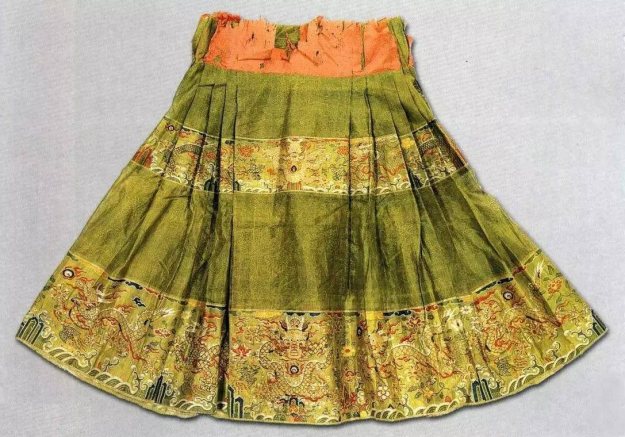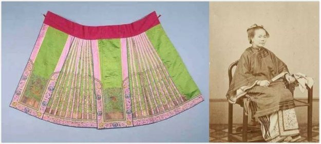 而到了清代,就有更多演用,不少博物馆里展出的马面裙,都是清代留存下来的马面。两个朝代常见的马面裙在型制上基本一致,但清代使用花样、颜色繁多的缘襈元素,缘襈,即为裙上修饰的襕边,清代的褶子也打得更密更多,有「百褶裙」之说。但也不能说这类缘襈裙就为清朝所有,而是从襕饰风格上来分辨,若说清代的缘襈繁复而盛艳,那么明代的襕边就看起来清爽大气。