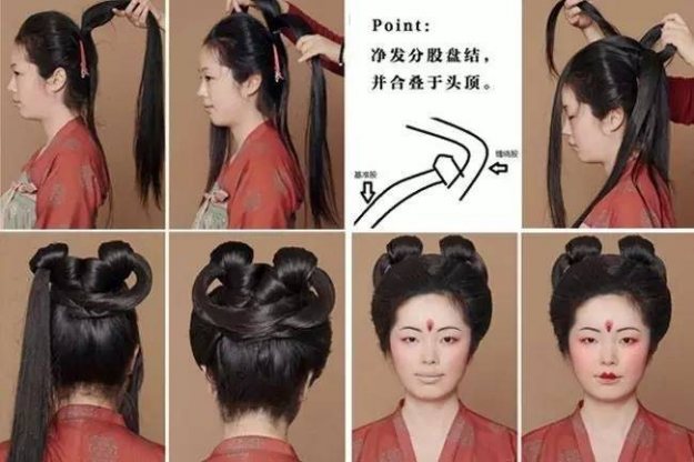 古代女子重视眉妆的程度大于眼妆,她们很仔细的画眉毛,眉形也有很多种变化。桃花妆的眉形,要画的像细细弯弯的月亮形状,所以称“却月眉”。贞观年间,画家阎立本所绘《步辇图》上,画中的宫女皆是这样的眉型。而这位女子所盘的发型叫做“百合髻”,从唐初开始就流行这种发型,唐代女子都有一双巧手,头发造型也是百变繁复,对现代人来说,简直是不可思议!