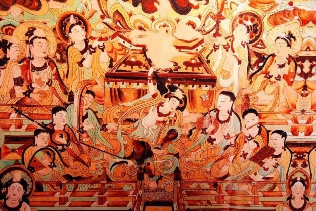 敲打在时间上的音乐,是来自古谱的记载,历代的乐器,皆奏响在敦煌的历史长河中。仔细聆听,清脆的响乐被拨奏在广泛的地域上空,这声音仿佛来自远方,来自佛国——筝、箫、阮咸、横笛、琵琶、箜篌……壁画之上,伎乐和时空交错,她的凝眉、她的气息、她的脉动……这是敦煌啊。旅行者恍然醒来。