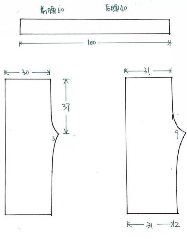 前腰60cm,后腰40cm,裤腰多余的量做成小褶。