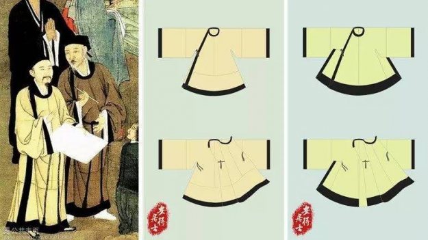 【襕衫】:出现于唐流行于宋明,《宋史·舆服志》记载“襕衫以白细布为之,圆领大袖,下施横襕为裳,腰间有襞积,进士、圆子生、州县生服之”。两宋时期的男子常服以襕衫为尚,下摆一横襕,以示上衣下裳之旧制。明代出现无膝襕襕衫,下摆处的衣缘较宽,取消了膝襕,可能有以衣缘象征膝襕的意思。中为宋制襕衫,右为明制襕衫。