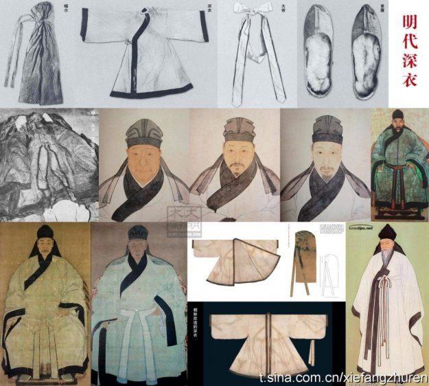 【深衣】明代多作为士人的礼服,用于祭祀、冠礼等传统礼仪场合,日常并不随便穿着。深衣用白色或玉色,交领,宽袖敞口,领、袖、衣襟、底边等处施皁色或青色缘边。衣身上下分裁,腰部以下为十二幅拼缝:大襟四幅,后襟四幅,两侧各一幅,小襟二幅。穿深衣时,头上戴幅巾、腰束大带与组带、足穿素履。(摘自撷芳主人微博)注:这里主要说是明代深衣,非朱子深衣。