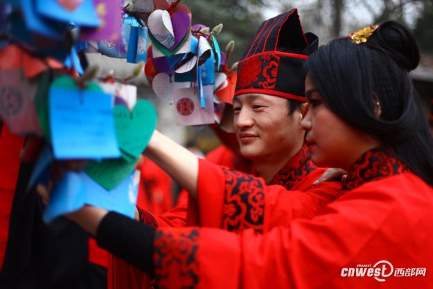 西安八对新人情人节体验汉式婚礼 爱汉服 2015-02-15 12:40 西方情人节,八对新人体验汉式婚礼上一页 1/8 下一页 西部网讯(记者 贺桐)昨天(2月14日)是情人节,一场“穿越时空”的汉式集体婚礼在西安举行。八对新人身着华丽的汉服,在赞礼官的主持下经过行交拜礼、沃盥礼、同牢礼、结发礼、执手礼等古典式的 "汉式"传统婚礼流程,结成百年之好。“现在很多年轻人都喜欢过西方的情人节,我觉得能体验下这个汉式婚礼,弘扬中国的传统文化也很有意义。”参加集体婚礼的巨女士说。
