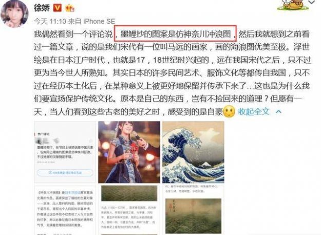 不过有网友在《我们来了》中,看到徐娇穿了一件叫做墨鲤抄的中国风服装,评论衣服图案是模仿日本的神奈川冲浪图,徐娇只好解释,这些东西都源自于华夏文化,并且列出了证据