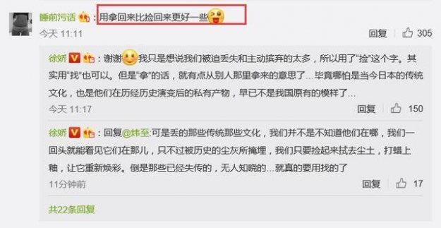 对徐娇的捡回来传统文化的说法,网友觉得用拿回来比较好,徐娇则是解释,我们丢的那些传统文化并不是不知道在哪,只不过被历史的尘灰所掩埋,我们只需要找到他,重新捡起来,擦擦尘土,洗洗干净,他就会重新的散发光彩,而那些失传的东西,真的要找回来了