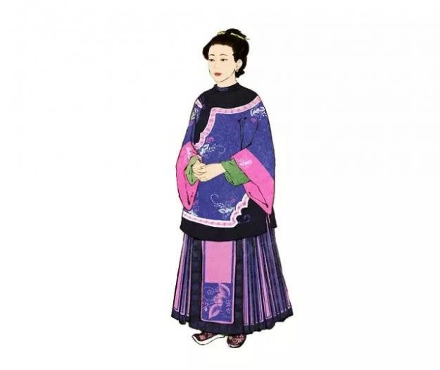 马面裙又名“马面褶裙”,前后共有四个裙门,两两重合,侧面打裥,中间裙门重合而成的光面,俗称“马面”。马面裙始于明朝(可能可以追溯更早),延续至民国,是我国传统裙装中很重要的一种。明代马面裙较为简洁,两侧的褶大而疏,为活褶。清代马面裙较为繁复,多用刺绣的等方式装饰马面,褶为死褶,细密有多至百褶。
