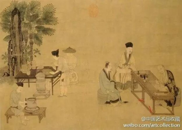 宋代流行点茶法,将茶压辗成粉末后放入茶盏中以水注点,用力搅拌使茶水混合成乳状再饮用,日本抹茶道就是然自宋代的点茶。中国茶道是一门饮茶艺术,深入日常生活诗词、绘画中。乾隆帝曾曰:“君不可一日无茶”,此语成为了茶融入日常生活的最佳写照。