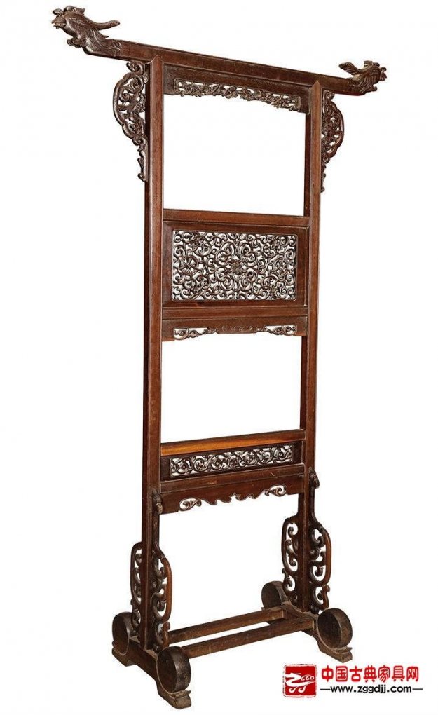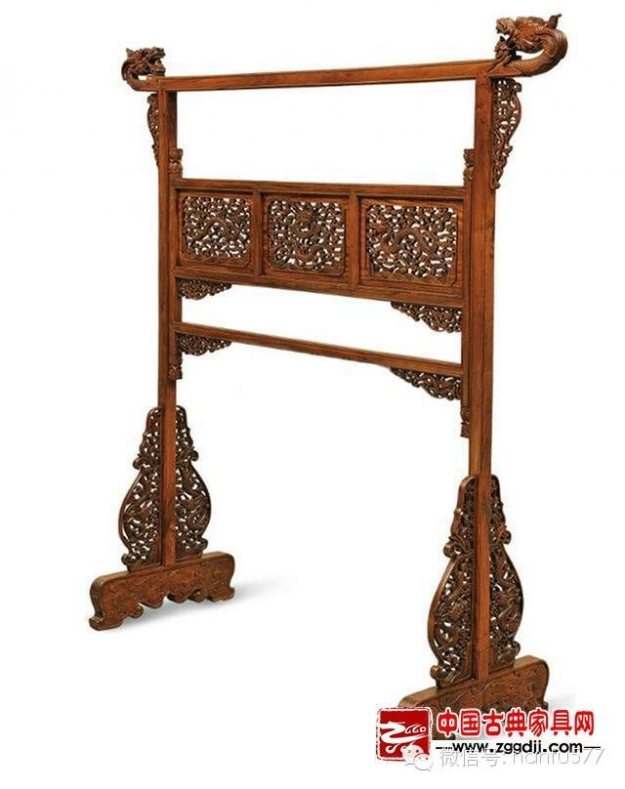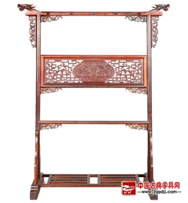 古人衣架,多采用横杆形式,两侧有立柱,上下承木墩底座,两座之间有横板或横枨,立柱顶端安横梁,两端长出立柱,尽端雕出龙凤纹或灵芝或云头之类。横杆之下安中牌子,上有透雕装饰,主要起牢固作用。衣服脱下后就搭在横杆之上。