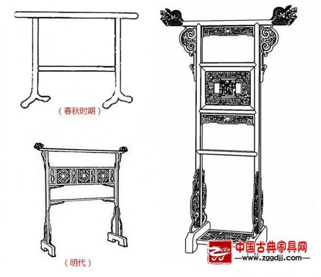 明代:明代衣架整体造型仍保持着传统模式,但用材、制作、装饰尤精。衣架下端以两块墩子木作足,里外两面浮雕回纹,炖上直立柱,前后两个镂雕卷草花站牙抵夹。站牙上部和下部分用楔与立柱和座墩连接,两墩安装用小块木料攒接的柃格,由于柃格具有一定的宽度,故可以摆放鞋履等物。各个横财与立柱结合部的下侧,都有透雕拐子回纹花牙承托。衣架从选材、设计、雕刻制作,在明代都达到了很高的艺术水平。