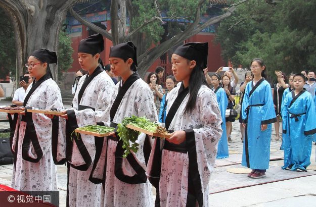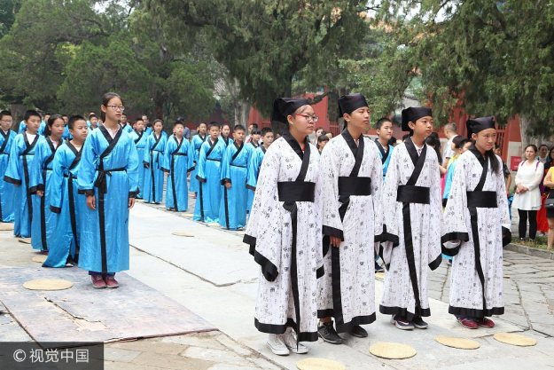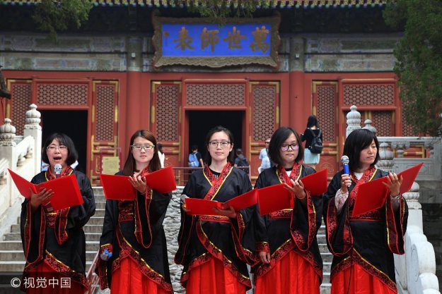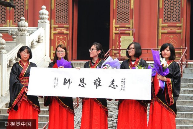 北京小学生着汉服在孔庙举行毕业典礼 视觉中国图播快报 2017-07-01 01:42 北京市广渠门中学附属花市小学教师在2017届毕业典礼上朗诵。身着汉服的小学生们在北京孔庙大成殿前进行释菜礼。小学生身穿汉服在北京孔庙大成殿前举行毕业典礼。 2017年6月28日,北京,小学生身穿汉服在孔庙大成殿前举行毕业典礼。当日,一场名为“陪伴是最长情的告白”北京市广渠门中学附属花市小学2017届毕业典礼在北京孔庙和国子监博物馆大成殿前举行。身着汉服的小学生们,在司礼官的主持下,四名主献官和全体师生以传统礼仪的方式,进行了释菜礼、谢师礼等传统礼仪仪式,使小学生们对中华传统礼仪和文化有了直观深刻的体验和感受。