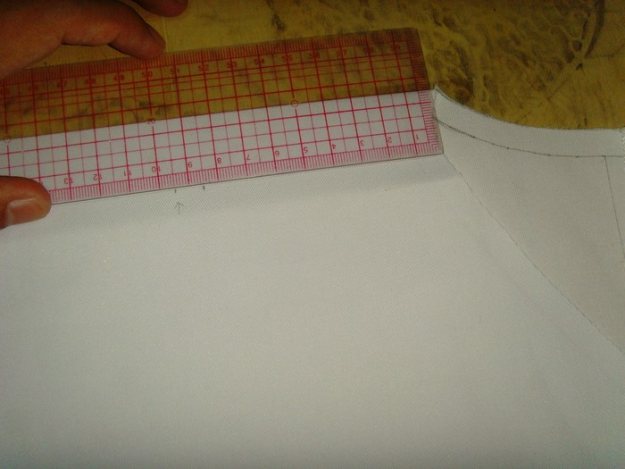 找到对折线,使用打版尺向前片衣片推进2.5厘米,因为我发现图形如果画在对称线上,实际穿着,彩绘会偏后,所以做出这个调整。