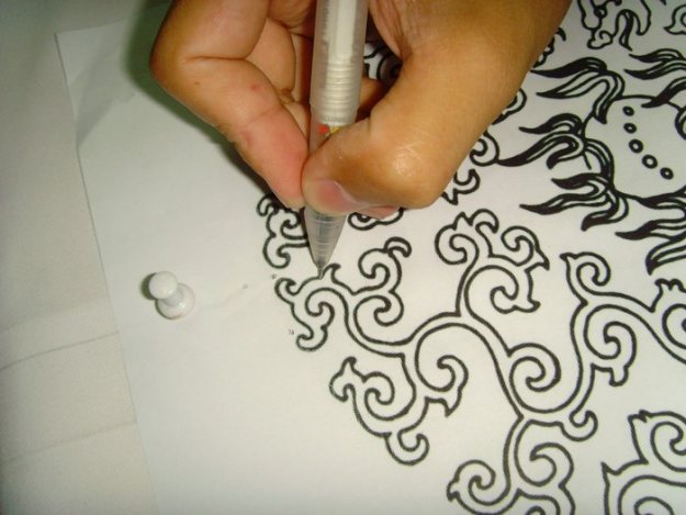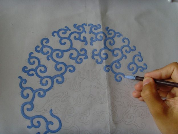 补充,彩绘也不可在成衣上进行,成衣是不好固定和铺平的,所以在半成品的时候进行最为恰当。