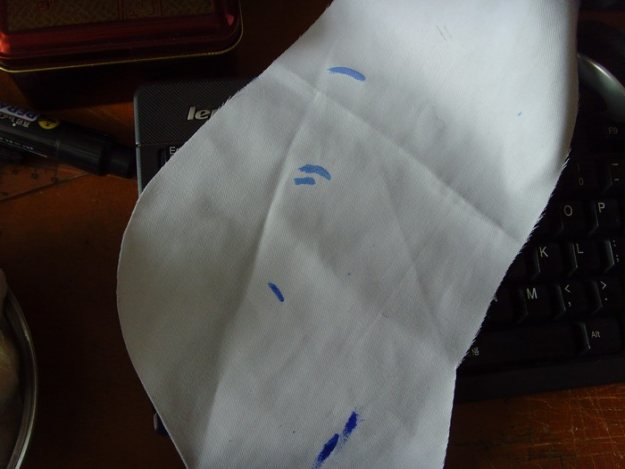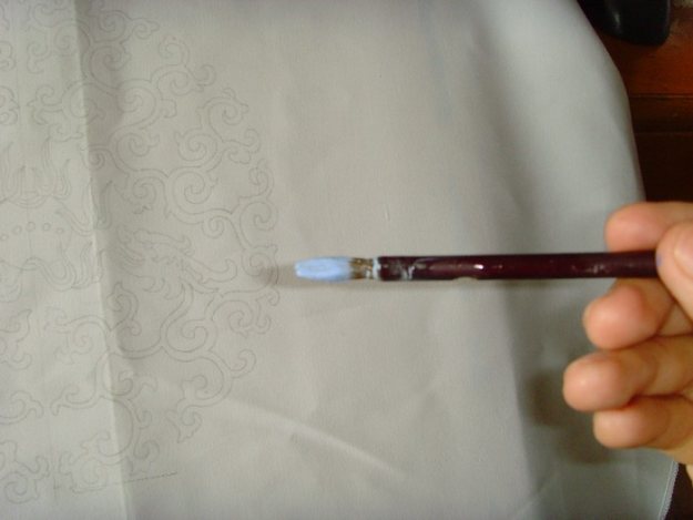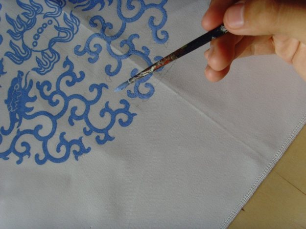 然后要取一块和面料材质一致的小块布料进行测试,要求调出的颜料不能太稠,太稠的话,首先是不好画,不顺畅,干后也会变得很硬。太稀也不行,太稀的话,绘画的时候容易出现晕染,使图像边缘不美观。但控制得好的话,干了之后彩绘处也会稍稍变硬,这是正常情况。