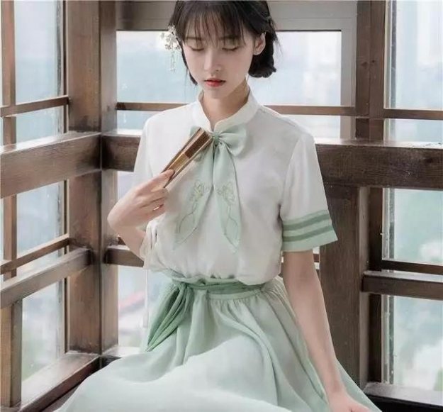 改良版中国风服饰,浅粉上衣加灰蓝裙两件套。融入了琵琶袖的元素,俏皮可爱;高收腰加蓬蓬的裙摆,修饰腿型,超显瘦;雪纺面料轻薄透气,上身超级舒适。