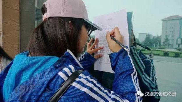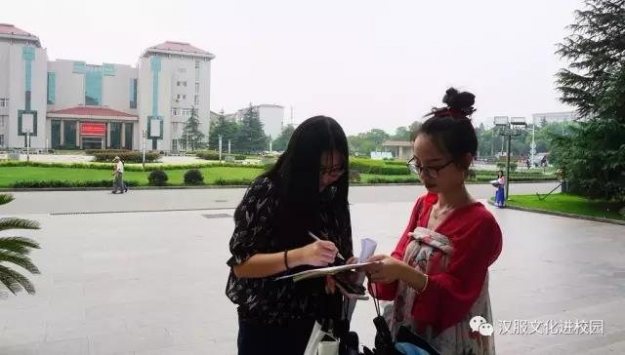 我们的活动形式很简单,主要是身穿汉服进行汉服文化的宣讲以及发放调查问卷。当我们团队六人身穿形制多样的汉服走在校园里或马路上的时候,便引起了行人的注目,我想这应该已经达到最大的宣传效果了。通过我们的实际调查,我发现大部分人对汉服还是不了解的,他们不知道汉服的种类及名称,也不了解汉服的历史,甚至还有人把我们穿的服装说成是少数民族的服饰。当然,也有知道并了解汉服的同学,她们和我们一样对汉服以及其承载的文化内涵都抱有极大的热情。这让我十分欣慰,因为在对汉服及汉文化的宣传中,我们不是孤军奋战,有很多伙伴在和我们一起努力。