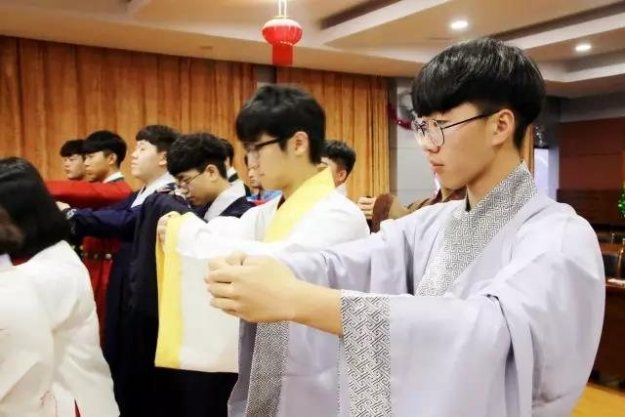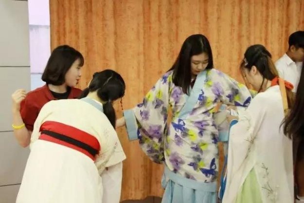 一番展示后,韩国学生纷纷跃跃欲试,身亲体验汉服之美。大概是文化相通的缘故,哪怕不教韩国学生怎么穿汉服,他们自己也驾轻就熟,很快都完成了换装。