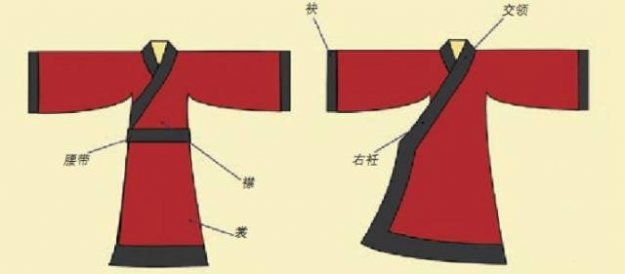 汉服采用幅宽二尺二寸的布帛剪裁而成 ,且分为领、襟、衽、衿、裾、袖、袂、带、韨等十部分。