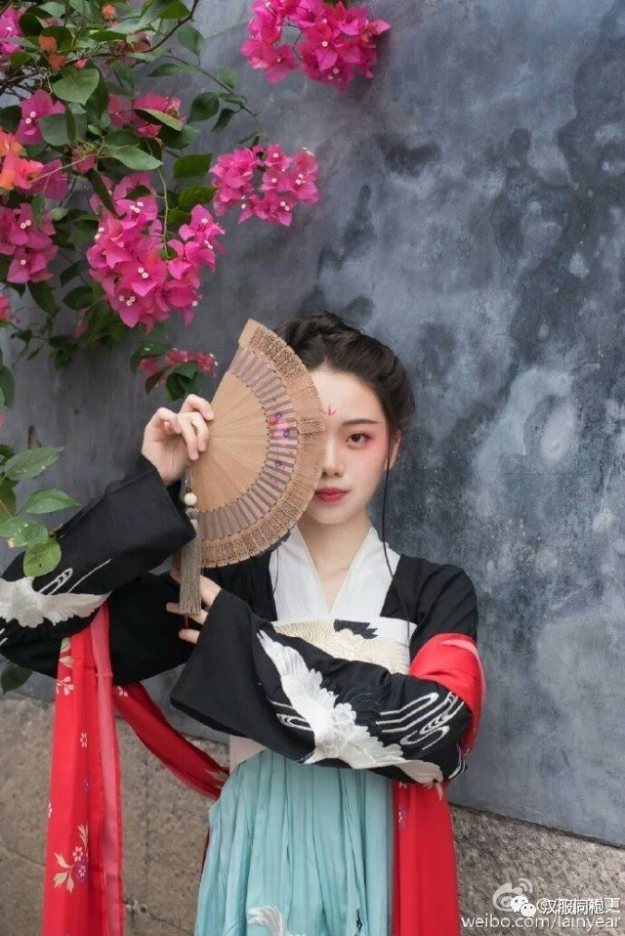 正红、纯白、纯黑在配色里属于基本色,水平的高下就在于颜色比例的运用。这套很大胆的用了纯黑色做上襦,不过厉害的是,用了仙鹤绣花来打破了黑色死板。偏冷的红色又压制住了下半身,平衡了原本的上深下浅。