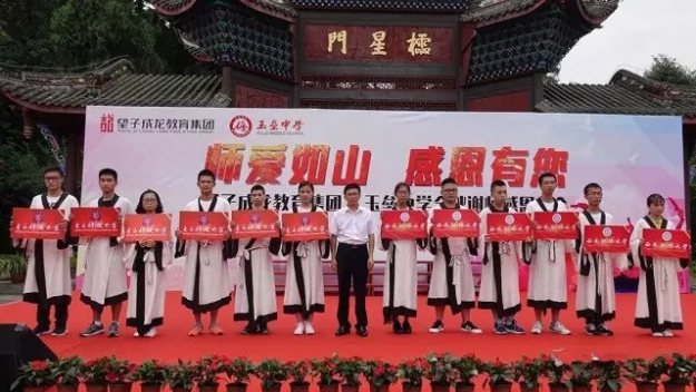 集体诵读完《礼记▪学记》,为学校献上锦旗,现场,近百位优秀毕业生还获得了励志奖学金。据了解,2017年,玉垒中学高考成绩创历史新高,勇夺全市文科1、2名。其中,第一名645分,全省排43位,第二名638分,全省排81位。全市理科前6名皆来自学校,第一名676分,全省排名257位;第二名674分,全省排名319位;第三名673分,全省排名352位。