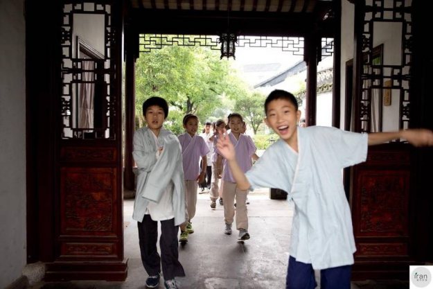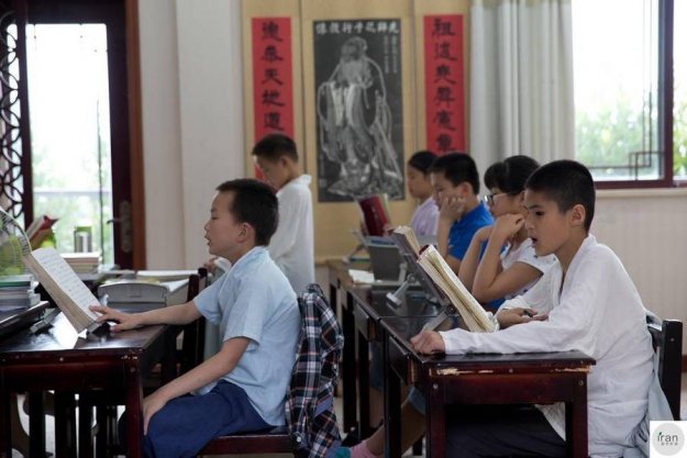 苏州太湖边有一群孩子“不上学”,每天着汉服、练武术、只读经典 凤凰网 2017-08-24 05:22 在苏州的太湖边有一群这样的孩子,他们着汉服、读经典、练武术。常常引得很多人驻足旁观。这群孩子是太湖边一个叫乐谦学堂的学生,他们和一般的孩子不同,没有上体制内的学校,而是回归传统的教学方式,在私塾里读书。读完书后,孩子们会再练一段武术,动作整齐划一,周围有不少人拍照喝彩。孩子们全都吃住在学堂里,每周回家一次,每天除了吃饭睡觉和玩耍时间,基本都在学堂里读各种经典,手指课本,大声朗读。这些孩子从3岁到14岁,差不多有50多个,都是在活泼好动的年纪,但在学堂的教室内,孩子们都非常专注读书,很少看到有开小差的。但到下课时,他们又恢复了孩子的玩闹天性,蹦蹦跳跳,打打闹闹,和上课时判若两人。学堂里最小的孩子是开办这个学堂的老师孩子,只有2岁,但读起经典来也是像模像样的。孩子们的读书环境非常清幽,是一座典型的苏州园林,假山流水、亭台楼阁非常古典。学堂的创办者是一对80后夫妻俩,他们说为了给孩子们最好的读书环境,这个学堂是他们花了大半年时间看了无数的房子后才找到的,这里既是孩子们的家,也是他们的家,他们的孩子也出生在这座园林里。如今社会上对于读经是好还是坏的争论还很大,但任何一种教育方式都会有利弊,最终只有用时间来证明,但可以肯定的是不管是孩子父母还是学堂的创办者,初衷都是为了孩子接受更好的教育。 在苏州的太湖边有一群这样的孩子,他们着汉服、读经典、练武术。常常引得很多人驻足旁观。这群孩子是太湖边一个叫乐谦学堂的学生,他们和一般的孩子不同,没有上体制内的学校,而是回归传统的教学方式,在私塾里读书。