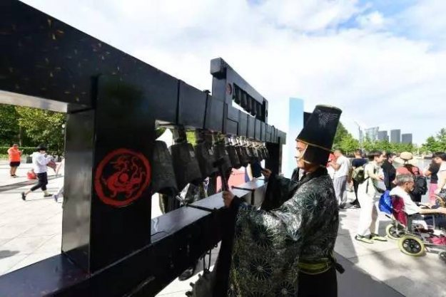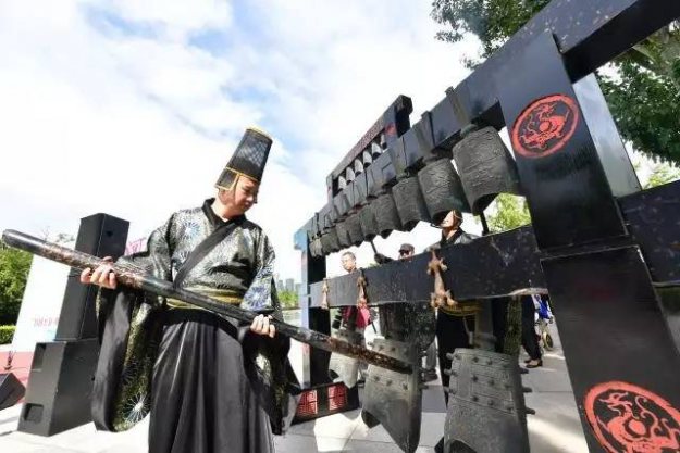 “叮——咚——叮”汉服表演结束后,现场响起了悦耳的乐曲,原来,这是演奏编钟的声音。