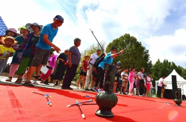 这边,大人和孩子们纷纷合着音乐,努力将一支支箭投到壶里。