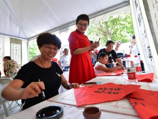 活动现场,在专业老师指导,参与者用毛笔写下“合”“爱”“福”等一个个幸福的字眼;画出牛郎、织女、喜鹊、月亮等一幅幅有着七夕元素的水墨画,在抒发美好心愿的同时也传承着我们的传统文化。