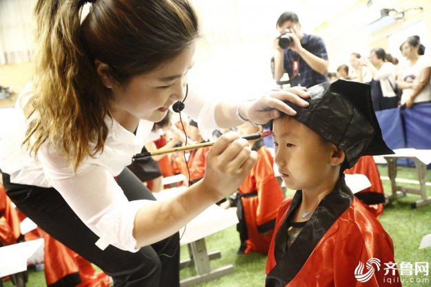 在开笔礼现场500多名小学生身穿中国红的汉服,正衣冠、明事理、行古礼,敬拜至圣先师-孔子。老师为孩子们朱砂开智,用朱砂在孩子们的额头正中逐一点上红痣,又称之为“开天眼”。