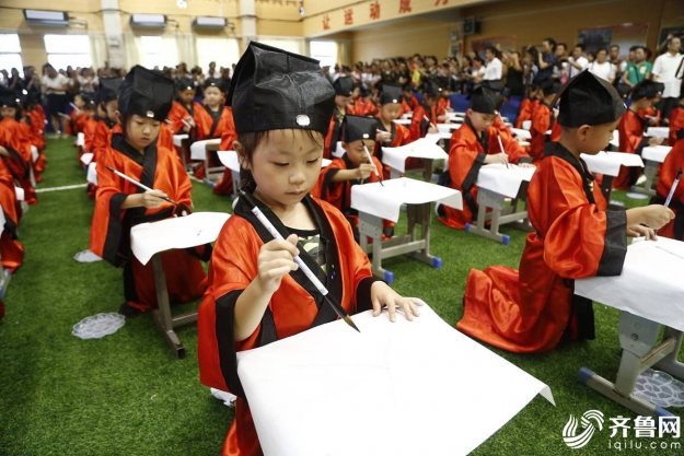 2017年9月8日,在山东泰安岳峰小学,500名刚入学的新生在学校统一组织下参加了开笔礼,感受中国传统文化的魅力。