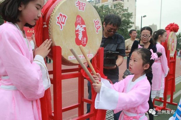 活动现场,孩子们向家长、老师、同伴鞠躬行礼;教师则用朱砂在学子们的额头正中点上红痣,称“开天眼”,又称“朱砂启智”。孩子们模仿古代读书人的样子,通过击鼓的方式表达他们的愿望。