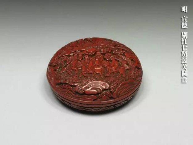 明宣德皇帝在位仅有十年,从传世的明宣德漆器看,品种有剔红、戗金彩漆等品种。明宣德雕漆的造型,盘有圆、方、荷叶式、菱花形,盒有蔗段式、蒸饼式、两撞委角方盒,另外还有盏托等。其装饰题材与明永乐时期基本相同,有花卉、云龙、云螭、山水、人物等。图案的处理出现了“开光”技巧。在盒盖上或盘内以莲瓣式、葵瓣式、圆形作为开光,开光内装饰一种纹饰,开光外装饰另一种纹饰。开光一方面能突出主题,另一方面也能把两种不同的纹饰分隔开来,同时也可起到美化画面的艺术效果。这种方法在明、清漆器图案中常被运用。