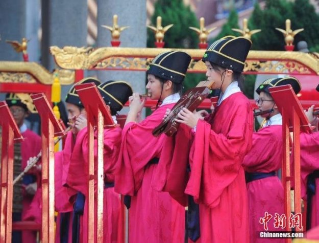 9月28日清晨,台北孔庙隆重举行祭孔大典,纪念孔子诞辰2567周年。活动遵循传统古礼仪节,分37个步骤进行。图为“乐生”在奏乐。