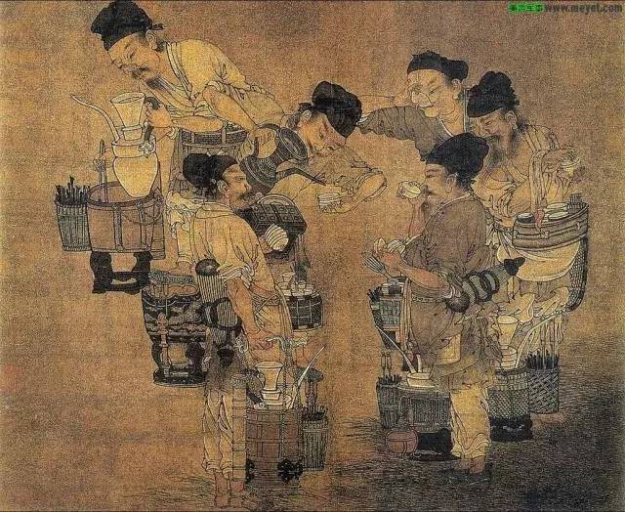 宋朝人喝茶,比唐朝有所改进,他们用小勺把茶末分到几个碗里,冲入滚水,一边冲一边搅,快速搅动,让茶末跟滚水充分混合,这叫“点茶”。点好的茶汤上面还会泛出一层乳白色的泡沫,好像卡布奇诺咖啡。