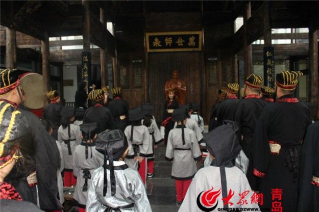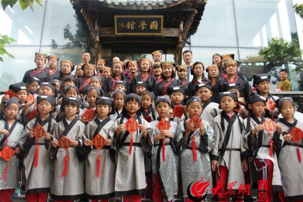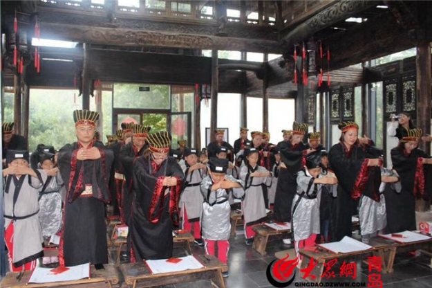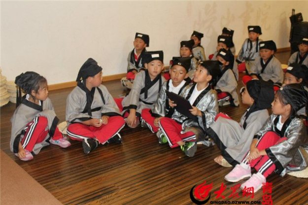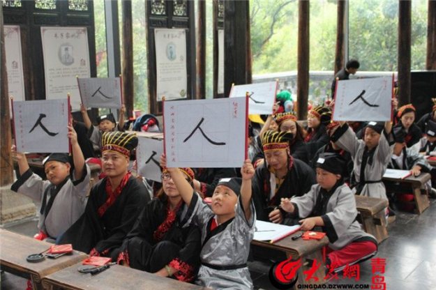 穿汉服、正衣冠、敬拜圣贤、朱砂启智、执笔描红、诵读经典、击鼓明志、颁发证书……2017年国庆中秋双节假期,青岛书院路小学二一中队在崂山书院举办了“向上吧 书院”古诗文大赛,“学七礼做七礼”“亲子运动会”等系列活动。走进崂山书院,国学馆、国粹民俗馆、主题馆、布施湖众多的徽派建筑,国学的氛围几乎无处不在,吸引着同学们停住脚步,踊跃咨询。