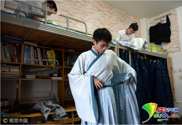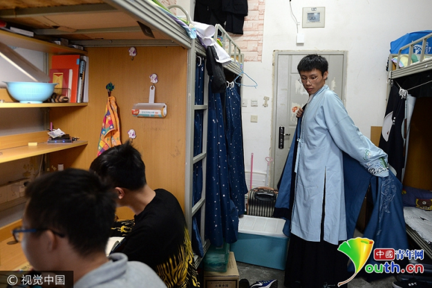 2017 年 10 月 10 日,成都,西南石油大学,康伟正在寝室穿汉服。西南石油大学大二学生康伟是忠实汉服爱好者,他奉行 “ 全日制 ” 汉服。 2017 年 10 月 10 日,成都,康伟是西南石油大学工商管理专业的一名男生,也是校园里很特别的那一位。他是一位忠实的汉服爱好者,在校园里践行 “ 全日制穿汉服 ”,除了一些规定着装的场合,他都会穿着汉服。这样的行为曾让一些同学不理解,但因为对于汉服以及传统文化的热爱,他坚持了下来,把这份文化传递给更多人。