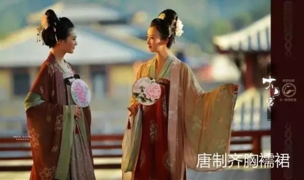 唐代妇女的裙子长度,与前代相比有明显的增加,裙裙曳地在当时是常见的现象。为显示裙子的修长,妇女着裙时多将裙腰束在胸部,有时甚至束至腋下,裙子的下摆则盖住脚面,有时在地下还拖曳一截。唐人诗文中常提及这种情况,如王建《宫词》谓:"黛眉小妇砑裙长";王翰《观蛮童为伎作》诗:"长裙锦带还留客";孟浩然《春情》诗:"坐时衣带萦纤草,行即裙裾扫落梅"等。形象资料中也有不少反映,如《簪花仕女图》、《执扇仕女图中,都绘有穿曳地长裙的妇女形象。为不妨碍活动,当时妇女穿着这种长裙劳作时,多特地将裙幅撩起,并在腰间以带系之。这样一来,裙裾就不会拖曳在地了。作这种装束的妇女形象,在唐代画家阎立本所绘的《步辇图》以及湖北武昌唐墓出土的陶俑上也都有反映。