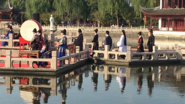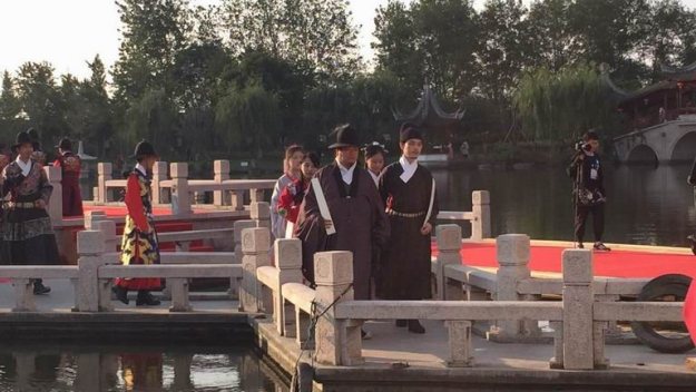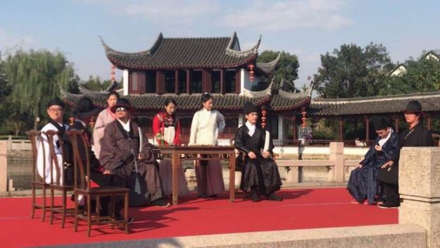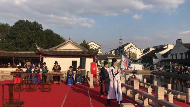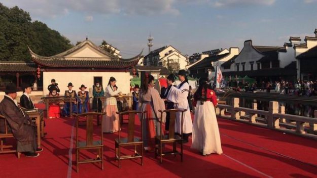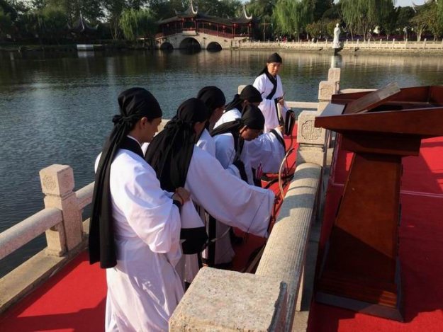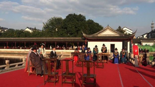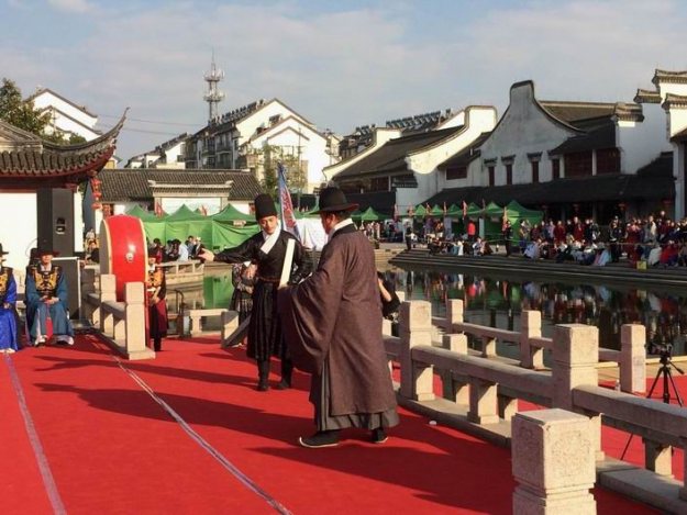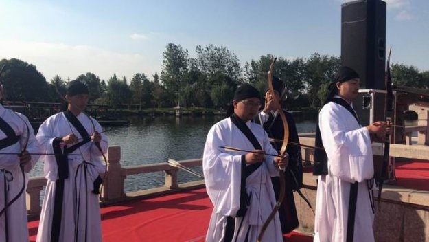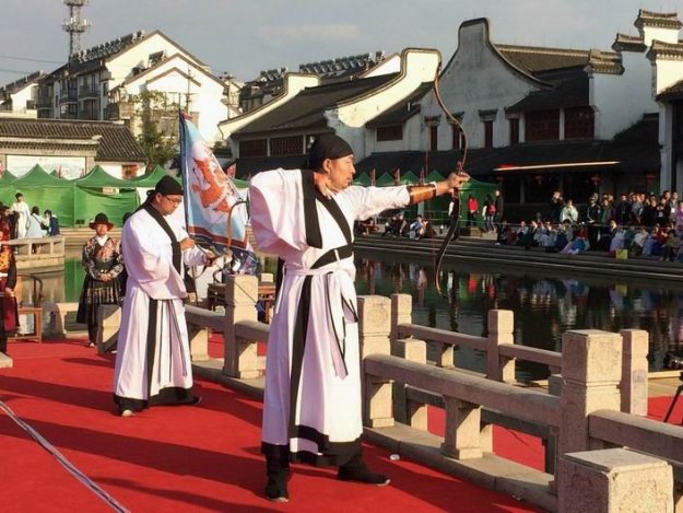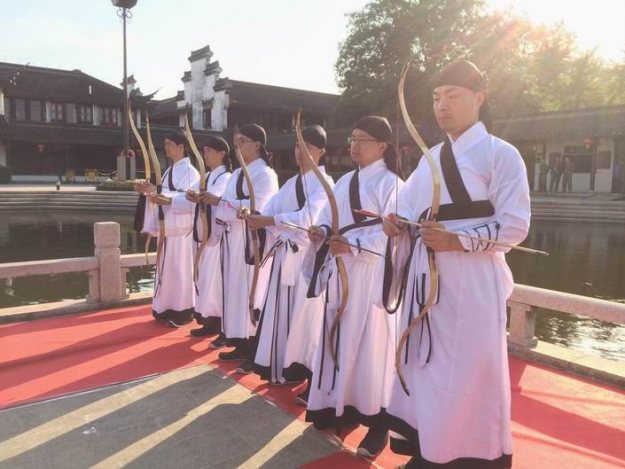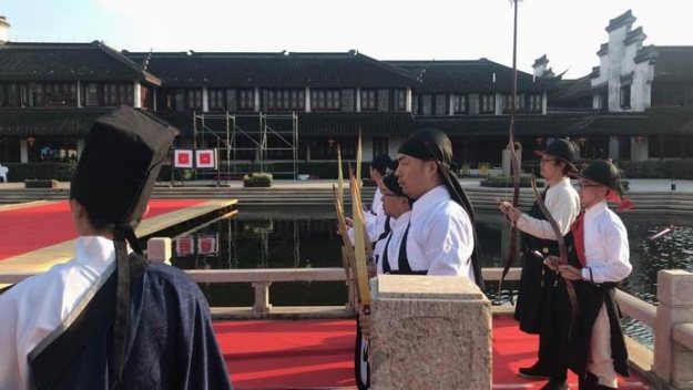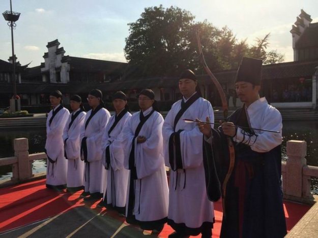 巧趋跄兮 射则臧兮:西塘汉服文化周传统射礼表演 凤凰网 2017-10-31 07:34 射礼是中华礼仪文化的重要形式之一,主要内容是宾主拜揖行礼,司射放好壶、中、算,宣布投壶之令(规则),主要有:必须将箭矢的端首掷入壶内才算投中;要依次投矢,抢先连投者投入亦不予计分;投中获胜者罚不胜者饮酒等等。至此,司射上堂对宾行揖礼,禀告宾:“三耦座射”(意思是三耦都已射毕)宾行揖礼还。图为第五届西塘汉服文化周传统射礼表演。射礼讲求立德正己、礼乐相和。倡导人格塑造和人的精神的文明,射礼讲究谦和、礼让、庄重,提倡“发而不中、反求诸己”,重视人的道德自省。在本质上是一种健康道德的巧妙导引方式,是华夏先民寓德于射、寓礼于射、寓教于射的珍贵的人文实践成果。图为第五届西塘汉服文化周传统射礼表演现场备礼:做好举礼的各种准备工作。布置好场地,组织好参礼及观礼人员。把弓、箭、筭筹等器具搬到西堂下陈设好。司射、有司、射者在西堂下面向南列队站好。获者就位。主人在场地外迎接宾的到来。图为凤凰历史主播现场采访射礼表演人员。开礼:司射自堂西取弓及箭,登堂报告宾,“弓矢既具,有司请射”。宾辞让,对曰:“某不能。为二三子。”许诺。司射踏在阶上,东北面告于主人,曰:“请射于宾,宾许。”请注意,射礼全过程中,司射都需挟乘弓矢。如果弓箭匮乏,可不做强求。纳射器:就是司射命令射者取纳弓箭用具。司射下阶,面向西命射者“纳射器”。上耦两人取各取弓一把,箭四只。配耦:司射把六名射者,将射艺相近者两两配合为一组,一共三组,分别称为上耦、次耦、下耦,是所谓“三耦”,每耦有上射、下射各一名。迎宾:宾至,主人迎上,相互行揖礼入场登堂而立。倚旌:就是司射命令获者以旌旗为射者指示靶心的位置。司射命获者,“倚旌于侯中”。获者把旌旗倚靠在侯的中央,为全场指示箭靶中心的位置。司射命令三耦:“依次而射,不得杂越!”上耦脱去左手的外衣衣袖,在右手拇指上戴上钩弓弦用的扳指,在右手臂上套好护臂,左手执弓,右手的指间夹一支箭,另外三支插在腰带中。诱射:即司射为众射者做示范。这其中有详细的礼节过程:由堂西行揖礼,然后进。到阶下时,北面行揖礼。踏上阶,揖。走上堂,揖。先将左足踩到射位符号上,面朝西,再扭头向南,注视靶的中部,表示心志在射箭,然后俯身察看双足,调整步武,最后开弓射箭,直至将四支箭全部射完。获者在其射完后,自乏后出,把箭取回,插到堂西的箭架上,然后返回原位。一番射:第一轮射。第一番射是习射,所以不管射中与否,都不计成绩。上耦的两位射手上堂射击,按照司射的要求在射位站好,目光盯住靶心,等待司射的命令。司射在堂下命令道:“无射获,无猎获!”(意思是,不许射伤报靶者!不许惊吓报靶者!)上射向司射行礼后射击,射出一箭后,再从腰间抽出一支箭搭在弦上,然后由下射射。如此轮流更替,直到将各自的四支箭射完。报靶者扬声向堂上报告射中的结果。接着,上耦下堂,次耦上堂,双方在西阶前交错时,相揖致意。(详细的礼节见前述礼仪要求部分)次耦习射的仪式与上耦相同。最后,次耦下堂,下耦上堂习射。至此,司射上堂对宾行揖礼,禀告宾:“三耦座射”(意思是三耦都已射毕)宾行揖礼还。二番射:第二轮射。第二番射是正式比赛,要根据射箭的成绩分出胜负。参加者除三耦之外,还有主人和宾。主人与宾配合为一耦,主人担任下射,以示谦敬。首先由三耦比射。司射命令上耦开始射击。两位射手相互拱手行礼后上堂,报靶者迅速离开靶位。司射宣布说:“不贯不释!”(凡是没有射穿箭靶的,一律不计成绩!)两位射手像第一番射时那样轮流开弓射箭。如果射中箭靶,负责计算成绩的有司,就抽出一支筭筹丢在地上。上射的筭筹丢在右边,下射的筭筹丢在左边。如此这般,三耦全部射毕。接着是由宾与主人配合成的耦上堂比射。比射的程序以及计算中靶次数的方法,与先前一样。射毕,有司拿起剩余的筭筹报告宾:“左右卒射”(左右射都已射完)然后,有司开始按照前面《计算成绩的方法》一节所介绍的方法,统计最后成绩并向宾报告。最后是罚酒及献酒环节。司射命令三耦和主宾耦:“胜者皆袒决遂,执张弓。不胜者皆袭,说决拾,却左手,右加弛弓于其上,遂以执弣。”(意思是,胜方射手脱去左袖,戴上扳指,套上护臂,手执拉紧弦的弓(表示能射)。负方射手穿上左衣袖,脱下扳指和护臂,将弓弦松开。)各耦射手先后上堂,负方射手站着将罚酒喝完,再向胜方射手拱手行礼。司射酌酒向报靶者献酒,并到靶前的左、中、右三处致祭。司射酌酒向堂下释筹的有司献酒。第二番射至此完成。三番射:第三番射的过程与二番射基本相同,只是比射时有音乐伴奏。乐工演奏《诗经·召南》中的《驺虞》,乐曲的节拍,要演奏得均匀如一。司射在堂下宣布:“不鼓不释!”(不按鼓的节奏射箭的,不得计数!)三番射与二番射的程序相同,先由三耦比射,然后主宾耦比射。凡是应着鼓的节拍而射中靶心者,有司就抽出一支筭筹扔到地上,最后将比赛的结果禀告宾:胜方赢若干筹,或者是双方射平。三耦、宾、主人顺序上堂,负方射手喝罚酒。三番射至此结束。旅酬:是射礼的余兴节目,古礼要求从身份高的人开始,依次向下进酬酒。我们建议,不分身份等级,参礼者相互敬茶或水。敬饮之前需相互行揖礼,乐队